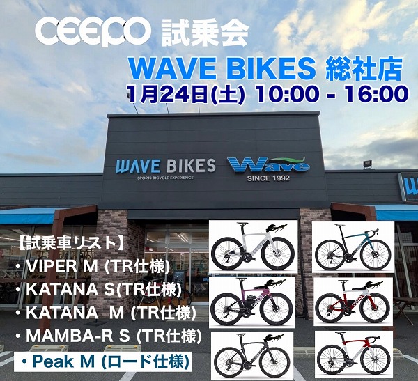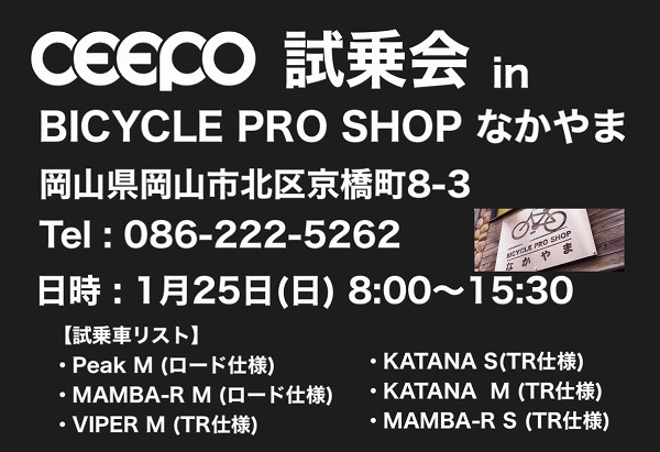 【今週末のCEEPO試乗会 in 岡山】 1月24日(土)25日(日)投稿者: ceepo2026年1月19日NEW 【今週末のCEEPO試乗会 in 岡山】⚫︎1月24日(土) 10:00〜16:00WAVE BIKES 総社店岡山県総社市中央4-1-103Tel : 086-631-7970⚫︎1月25日(日) 8:00〜15:30BICYCLE PRO SHOP なかやま岡山県岡山市北区京橋町8-3Tel : 086-222-5262CEEPOのテクノロジーを集結して開発されたスーパーロードバイク「Peak」ロードにも使用できるトライアスロンバイク「MAMBA-R」トライアスロン専用バイク「VIPER」「KATANA」をお試し下さい。
