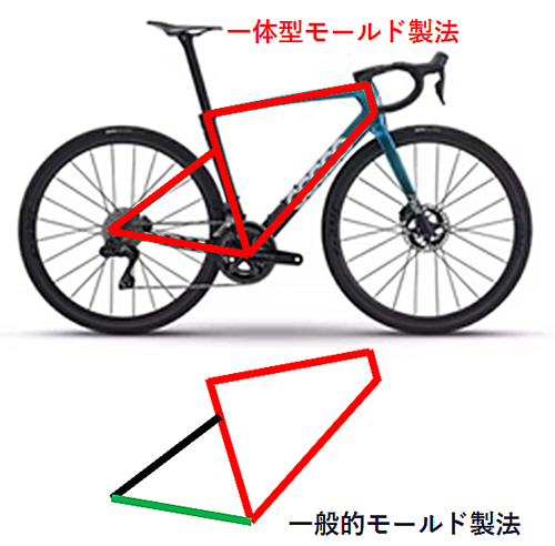 カーボンフレームの製法は前三角(トップチューブ、ヘッドチューブ、シートチューブ)を一つのモールドで製造し、後からシートステイとチェーンステイを繋げる方法が一般的です。