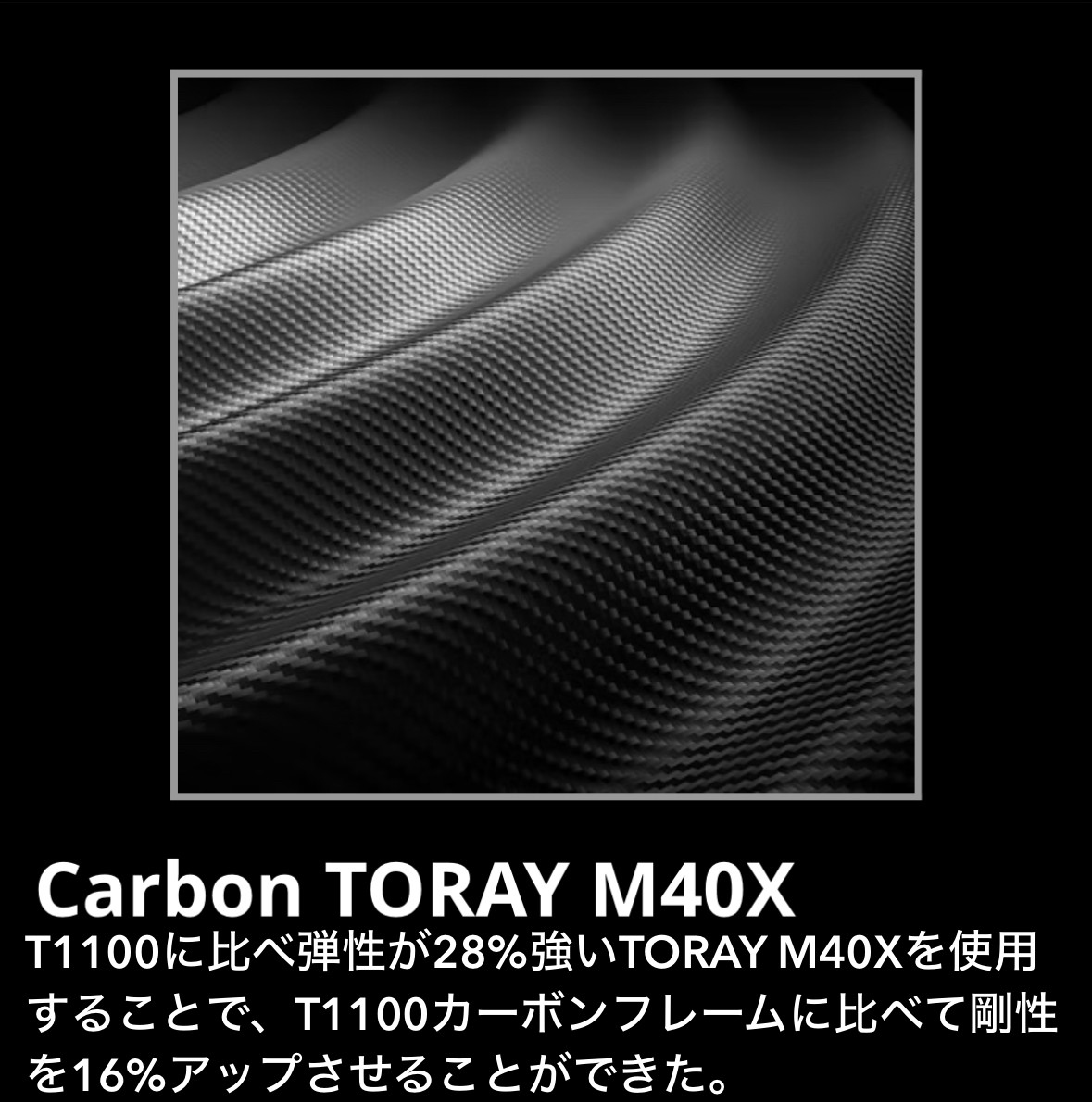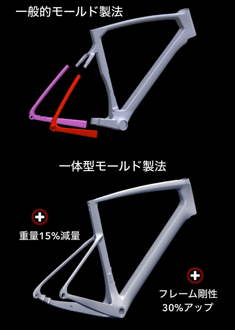 この一体型モールド製法に特別ハイグレードカーボン素材TORAY M40Xを使用することで、これまでにないフレームの軽量化が実現し、更にフレーム剛性を16%アップさせることが出来ました。