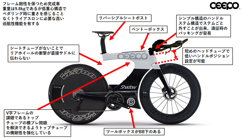 - Shadow-Rと同じジオメトリーにも関わらず、フロントフォークをスタンダードタイプに変える事で、完成車の重心位置がBB周辺となり、フレーム重量9.3kgを全く感じさせない軽量バイクと同じレベルの加速性能と登坂性能を体感できます。