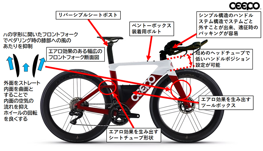 - KATANAは巡航性能と登坂性能の中間に位置づけされる機能で開発され、いろいろなタイプのコースに対応できるという理由でCEEPOのトライアスロンバイクのラインナップの中で一番人気のモデルです。