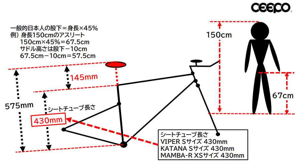 (身長150㎝のアスリートがポジションを出せるフレームサイズ)